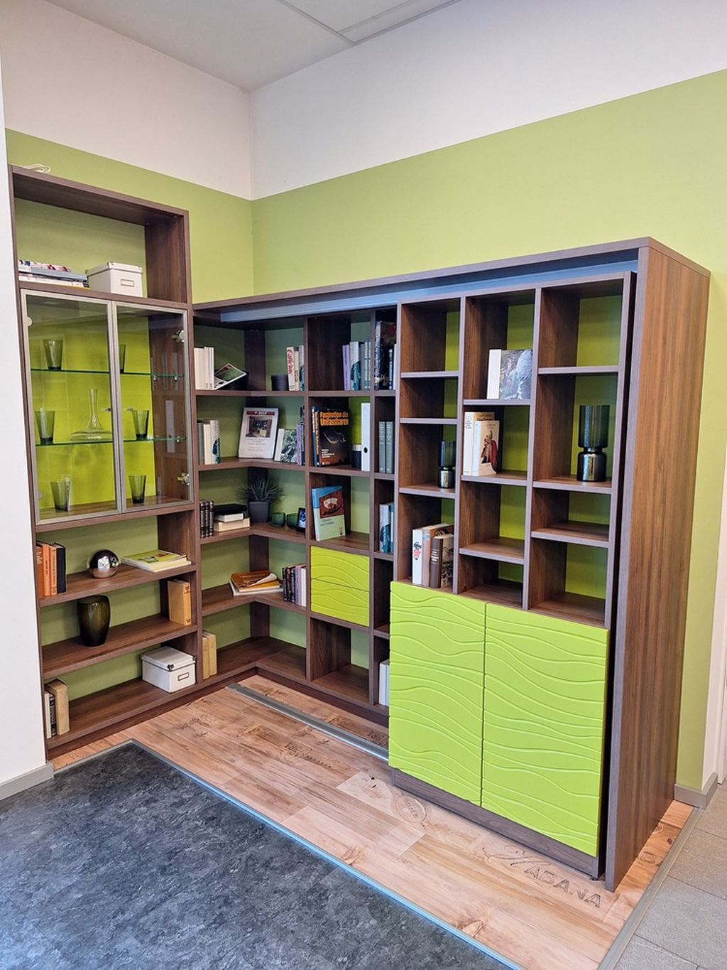 € 1.000 € 3.560Bücherregal mit Rima Schiebekorpus in Dekor Robinie und Lack Neongrün