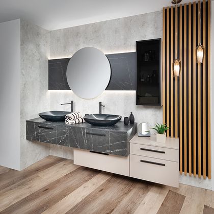 Ein Doppelwaschtisch bietet Platz für zwei Personen und gleichzeitig die Chance für mehr Stauraum. Ein nach Maß gefertigter Unterschrank kann so geplant werden, dass jede Person im Haushalt seinen abgetrennten Bereich hat. Etwa durch integrierte Schubladen.