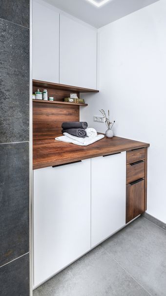 Gerade im Badezimmer ist der Stauraum besonders wichtig. Bei Standardbädern geht dieser oft verloren. Nicht so bei einem nach Maß gefertigten Badmöbel aus unserem Haus. Hier wird oft und gern auch die Waschmaschine mit verbaut und voll integriert.