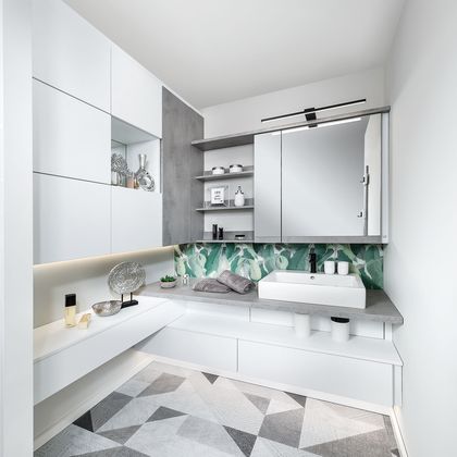 - Größe des Schminktisches: Meist ist der Platz für einen Schminktisch im Badezimmer begrenzt. Doch ein Schminkplatz nach Maß kann dennoch großzügig ausgestattet sein. Entscheidend ist, die Raumsituation bei der Planung zu berücksichtigen und integrierten Stauraum zu schaffen.