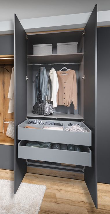 Organisationstalent: Statten Sie Ihre Garderobe mit allen Funktionen aus, die für Sie wichtig sind. Das kann ein Kleiderlift sein, um schneller Jacken und Hemden aufhängen oder herunternehmen zu können. Auch ein Hosen- oder Schuhauszug ist denkbar. Sie bestimmen ebenfalls die Anzahl an Fächern und Garderobenstangen. So bleiben Sie stets bestens organisiert.